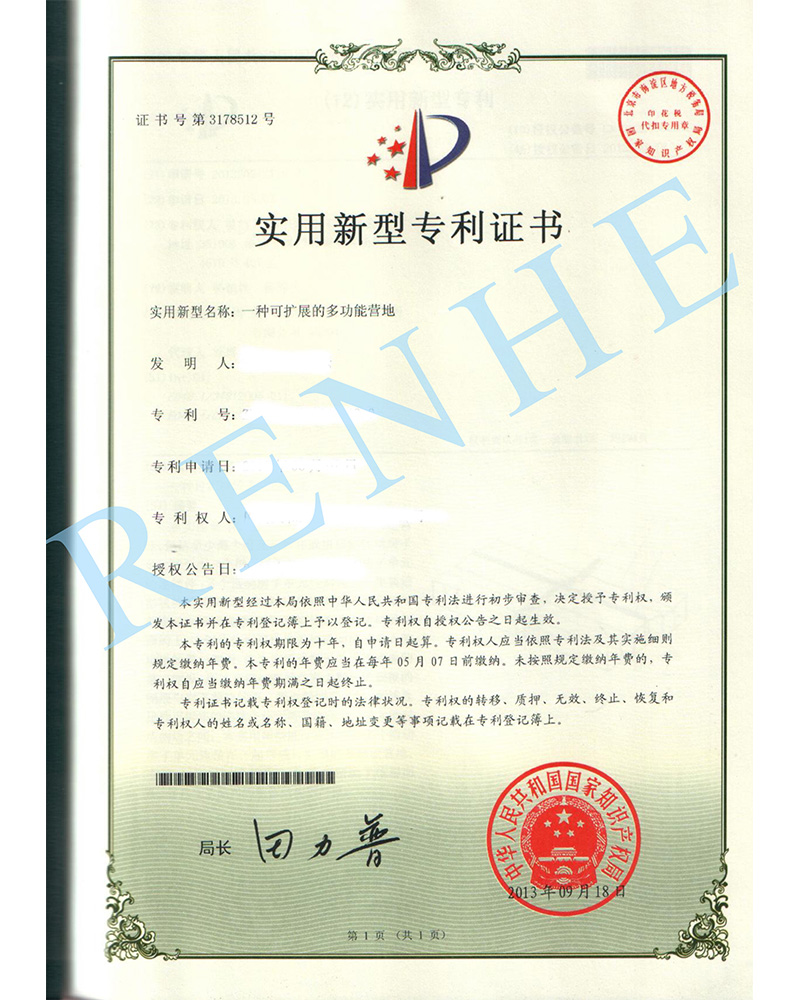 一種可擴展的多功能營地實用新型專利證書