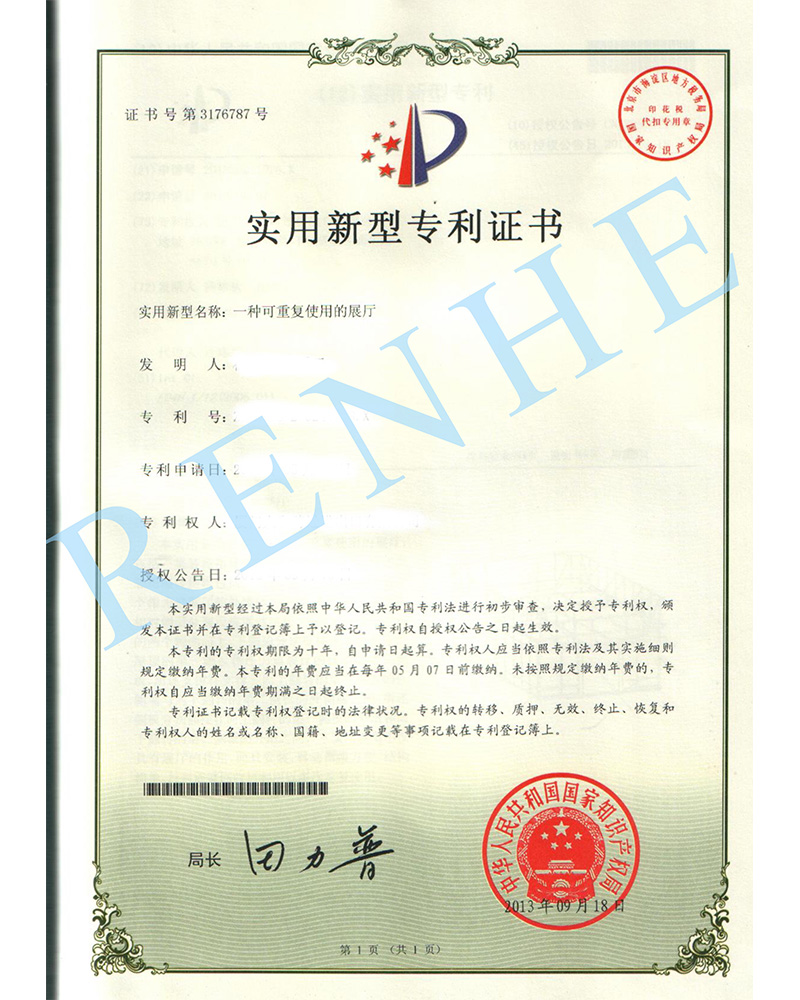 一種可重復(fù)使用的展廳實用新型專利證書